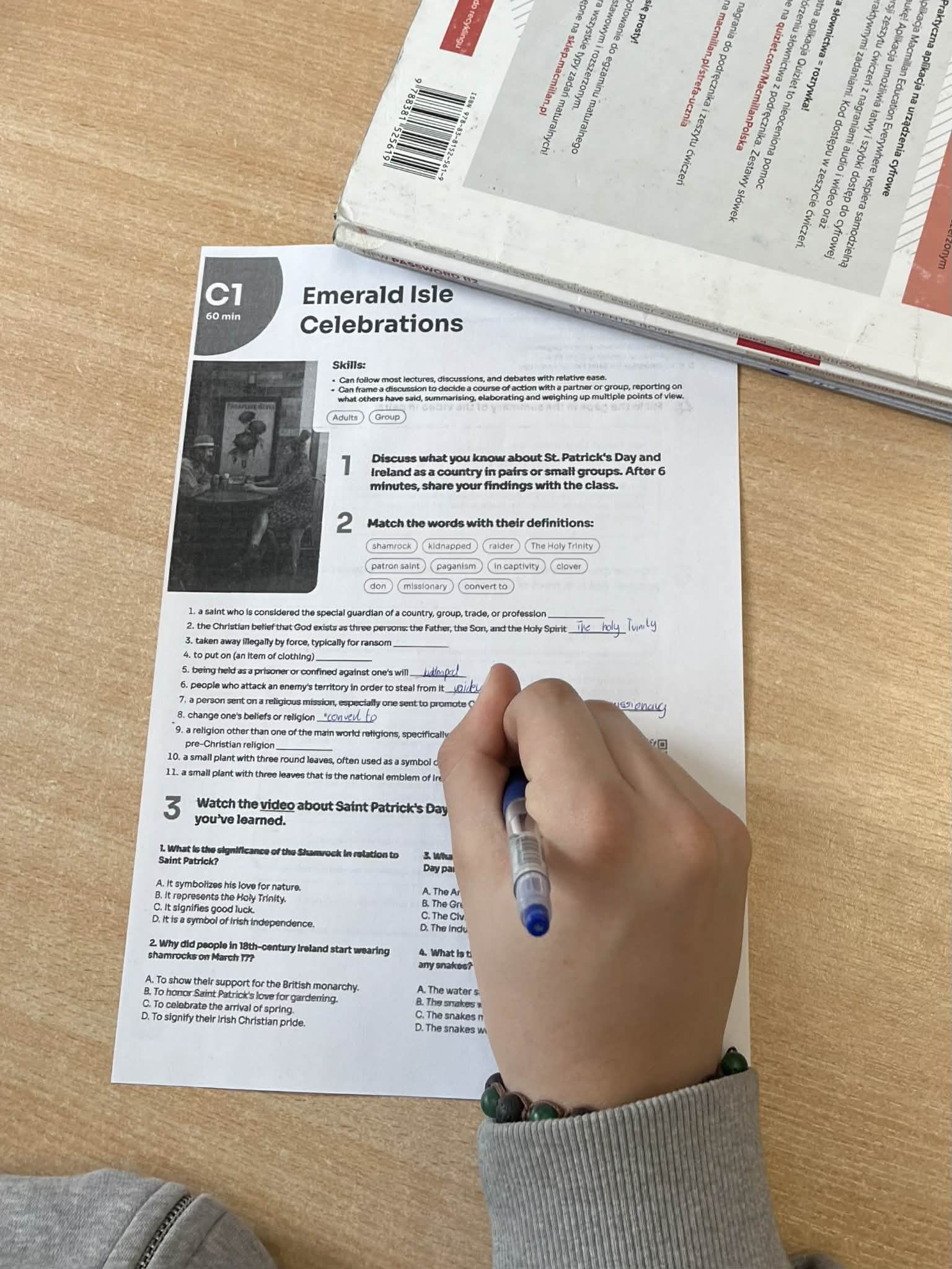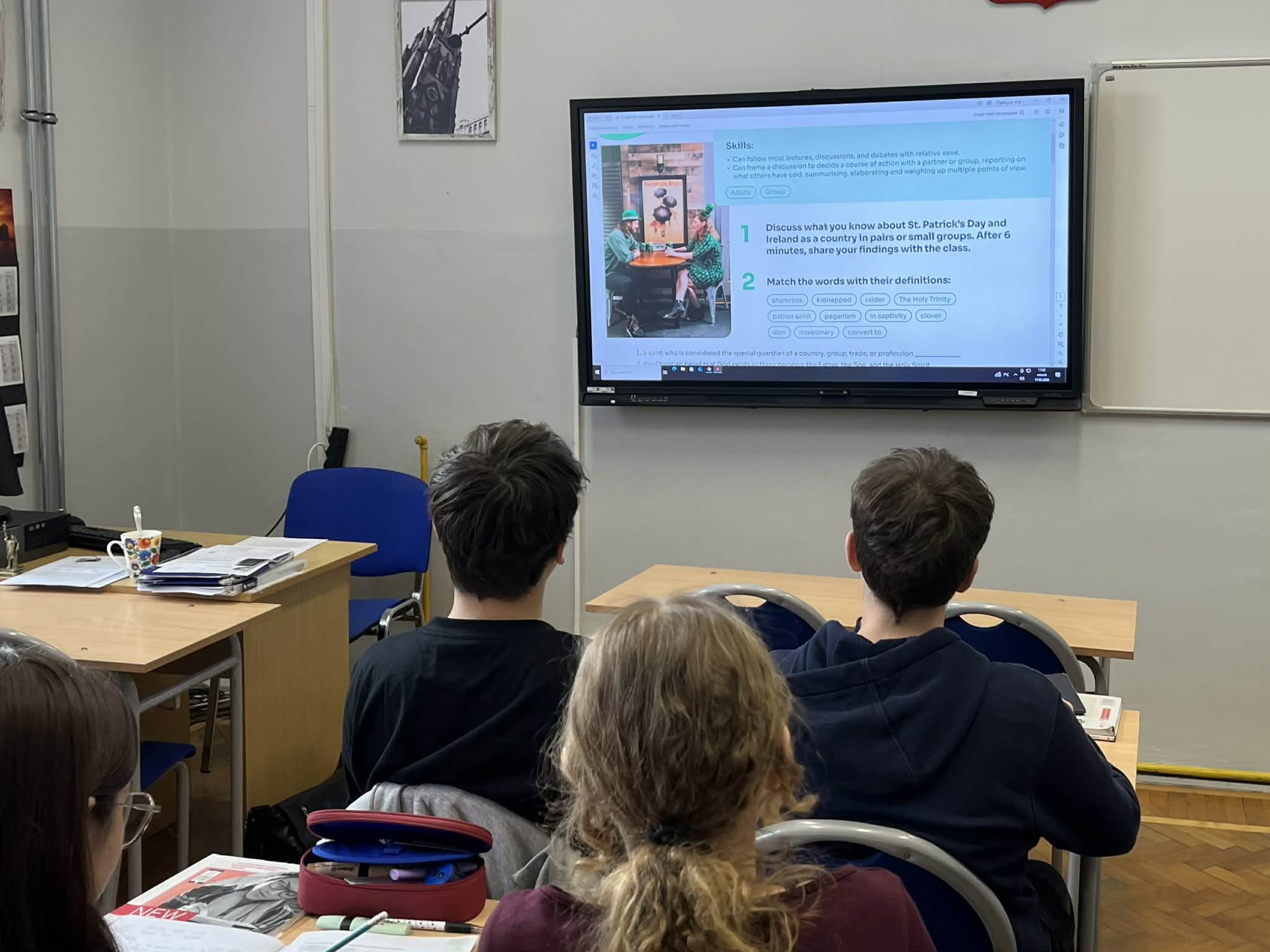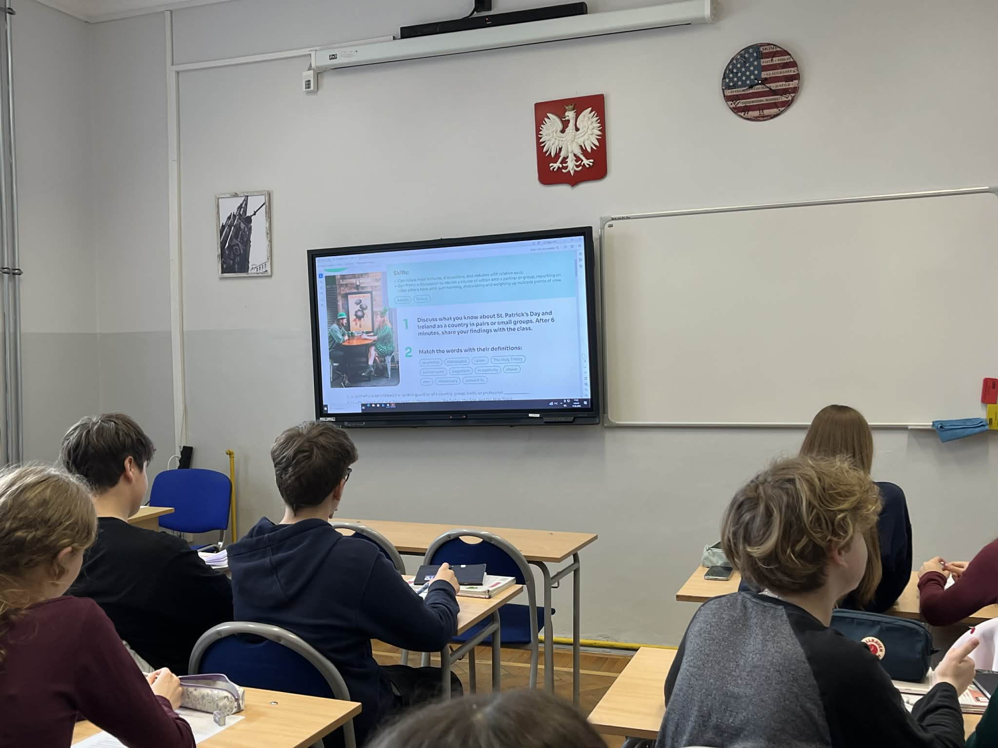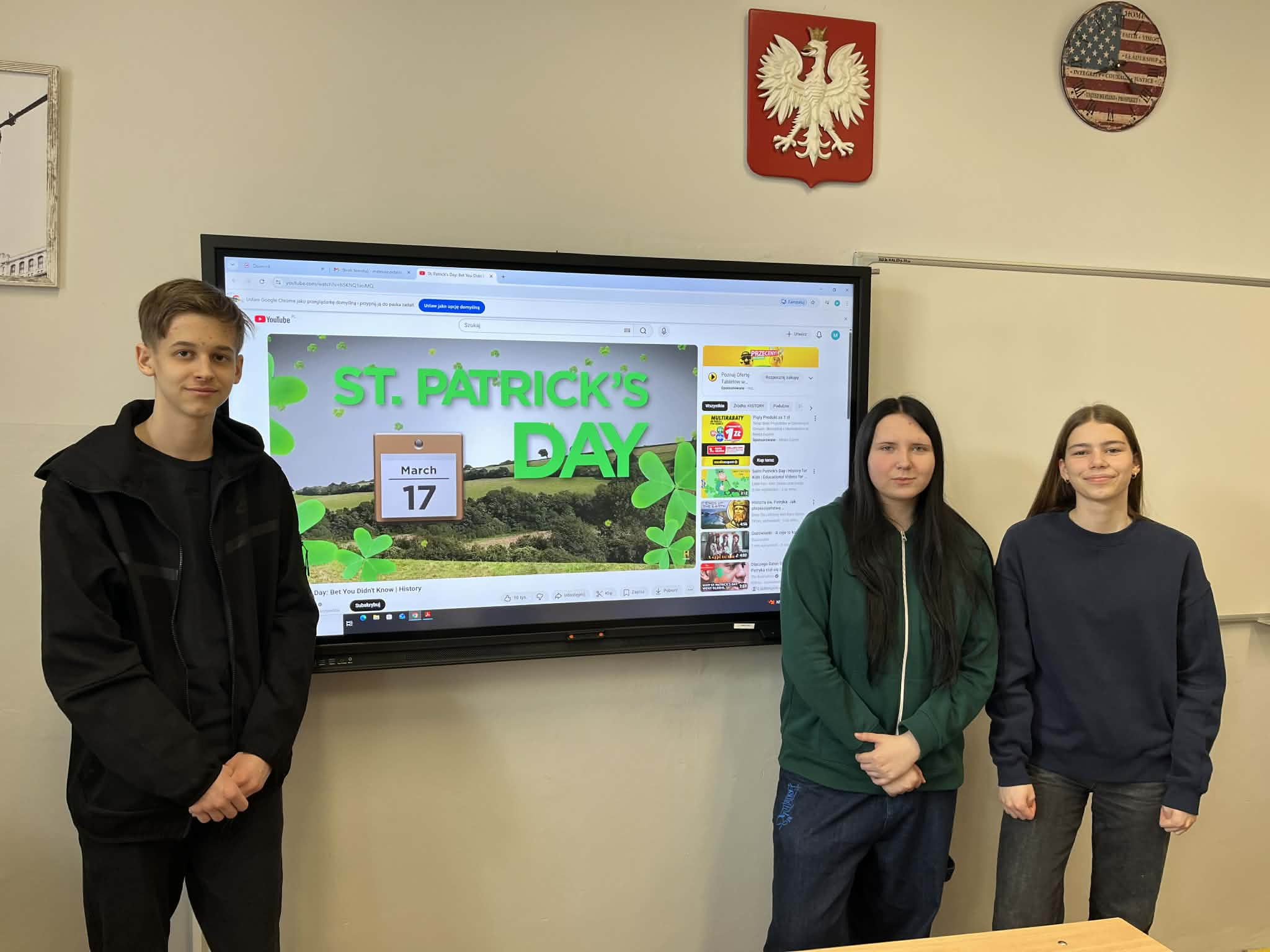 Klasa 3D o profilu prawnym przygotowała ciekawe fakty dotyczące Irlandii, które zostały zapisane na karteczkach i rozmieszone w sali. Uczniowie podczas tej lekcji mieli również okazję do wyćwiczenia irlandzkiego akcentu na podstawie krótkich filmików edukacyjnych.