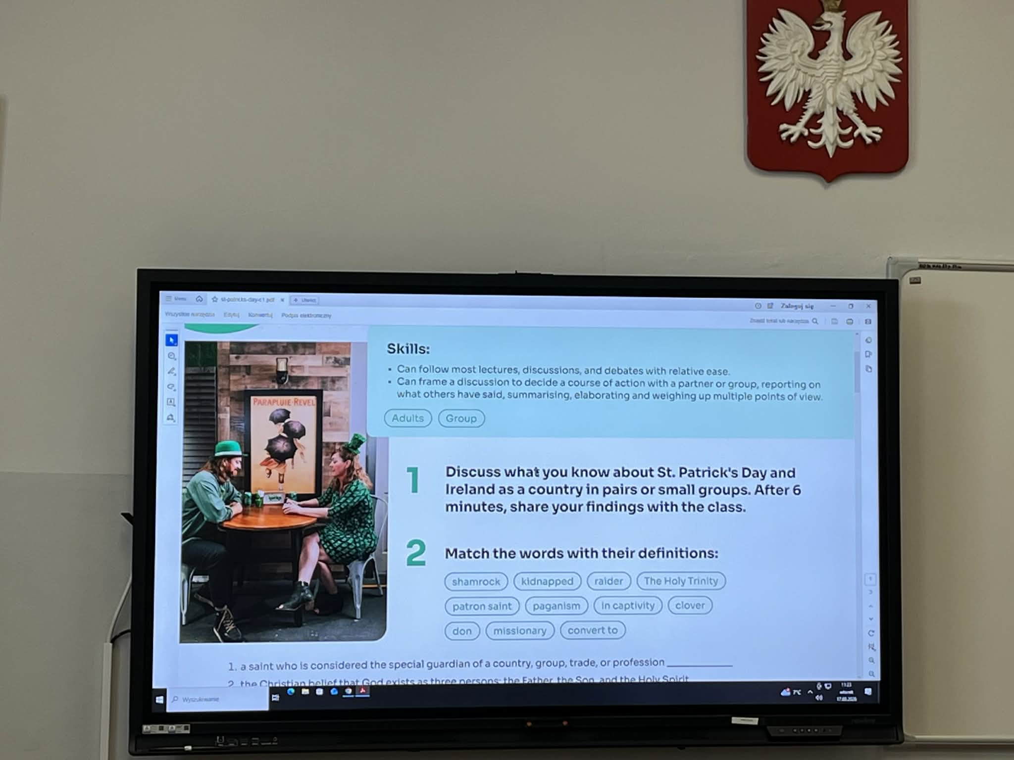 Klasa 1A o profilu językowo-dwujęzycznym rozpoczęła swoją lekcję od krótkiej rozmowy na temat tego co może być związane z Irlandią. W trakcie lekcji uczniowie poszerzyli również słownictwo związane z tym krajem i dowiedzieli się czegoś więcej na temat historii tego państwa oraz jego patrona Świętego Patryka. Na koniec miłym zaskoczeniem dla Plateran było obejrzenie krótkiego filmiku prezentującego typowy irlandzki taniec.