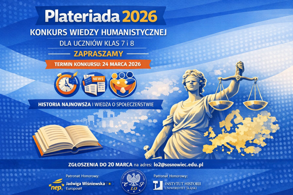 19 marca 2026 Plateriada 2026 Regulamin Międzyszkolnego Konkursu Humanistycznego PLATERIADA Inne artykuły Konkursy Gigathon – Ogólnopolski Konkurs 2 kwietnia 2026 0 Informujemy, że ruszyły zapisy do Gigathonu – Ogólnopolskiego Konkursu Matematyczno-Informatycznego, który... Konkurs recytatorski „Moja hierarchia wartości” – konkurs 2 kwietnia 2026 0 W dniu 23 marca w naszym Liceum odbyła się... Konkursy X edycja konkursu PLATERIADA rozstrzygnięta! 2 kwietnia 2026 0 W tym roku szkolnym turniejowe zmagania uczniów szkół podstawowych... Akcje Dzień Przedsiębiorczości – spotkania z przedstawicielami uczelni ekonomicznych 25 marca 2026 0 W ramach Dnia Przedsiębiorczości odbyła się w naszej szkole... Konkursy Konkurs „Speaker’s Culture Corner” 30 marca 2026 0 Laureaci Wojewódzkiego Konkursu Języka Angielskiego dla Szkół Podstawowych "Speaker's...
